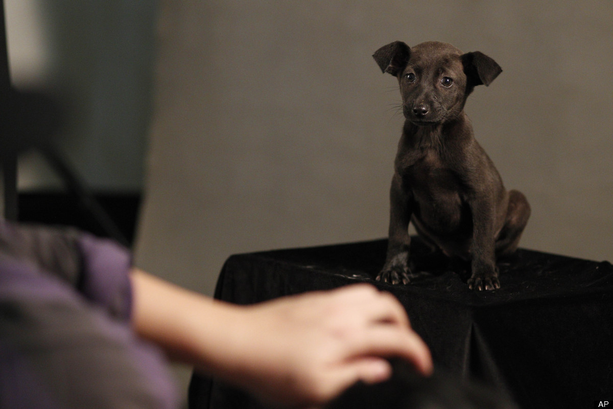 Taoyuan, Taiwan - O fotógrafo cuidadosamente coloca um pequeno filhote de cachorro mestiço em uma plataforma em seu estúdio improvisado, em um abrigo de animais no norte de Taiwan. O cão parece ter cerca de 2 meses de idade, com olhos confiantes de alerta, e um pelo brilhante.